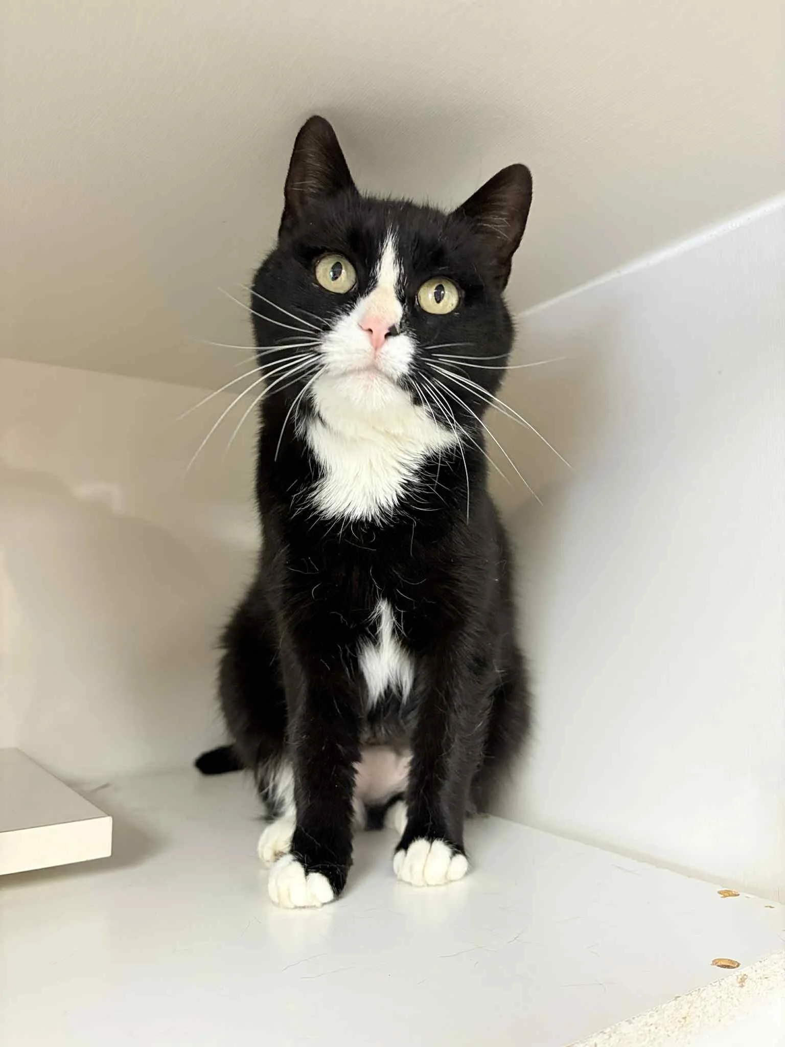 Tote Bag is an approximately 1 year old spayed female black and white cat who was brought to us when she was found living alone outdoors. Totes is a friendly girl, LOVES people and would likely do well with other cats with a proper introduction. If you'd like to meet her, please call us at 446-4107 to make an appointment